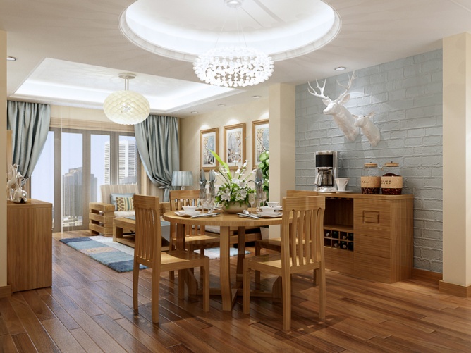 圆形的吊顶和圆面餐桌相呼应,精美的水晶吊灯提升了亮度,柔和自然。餐边柜上方的鹿头装饰,代表“俸禄”,象征着吉祥富贵升官发财的寓意,大吉大利。